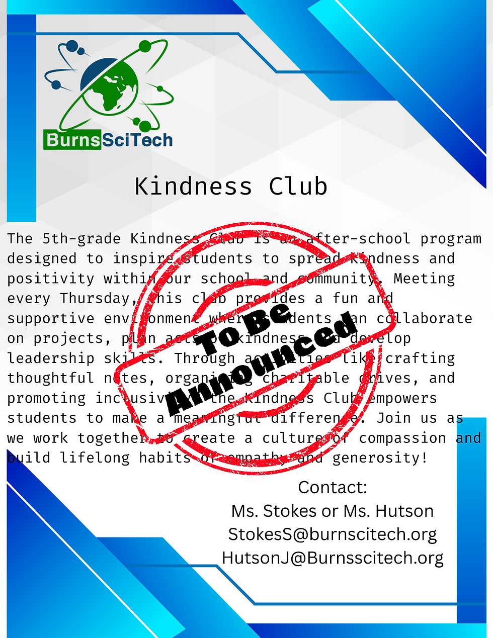 The 5th-grade Kindness Club is an after-school program designed to inspire students to spread kindness and positivity within our school and community. Meeting every Thursday, this club provides a fun and supportive environment where students can collaborate on projects, plan acts of kindness and develop leadership skills. Through activities like crafting thoughtful notes, organizing charitable drives, and promoting inclusivity, the Kindness Club empowers students to make a meaningful difference. Join us as we work together to create a culture of compassion and build lifelong habits of empathy and generosity!