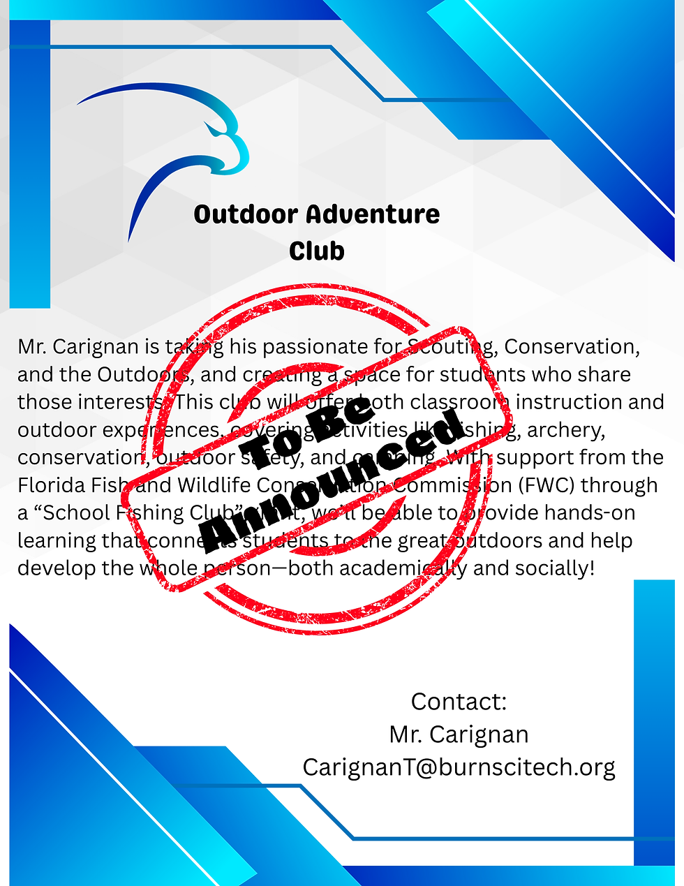 Mr. Carignan is taking his passionate for Scouting, Conservation, and the Outdoors, and creating a space for students who share those interests. This club will offer both classroom instruction and outdoor experiences, covering activities like fishing, archery, conservation, outdoor safety, and camping. With support from the Florida Fish and Wildlife Conservation Commission (FWC) through a “School Fishing Club” grant, we’ll be able to provide hands-on learning that connects students to the great outdoors and help develop the whole person—both academically and socially!